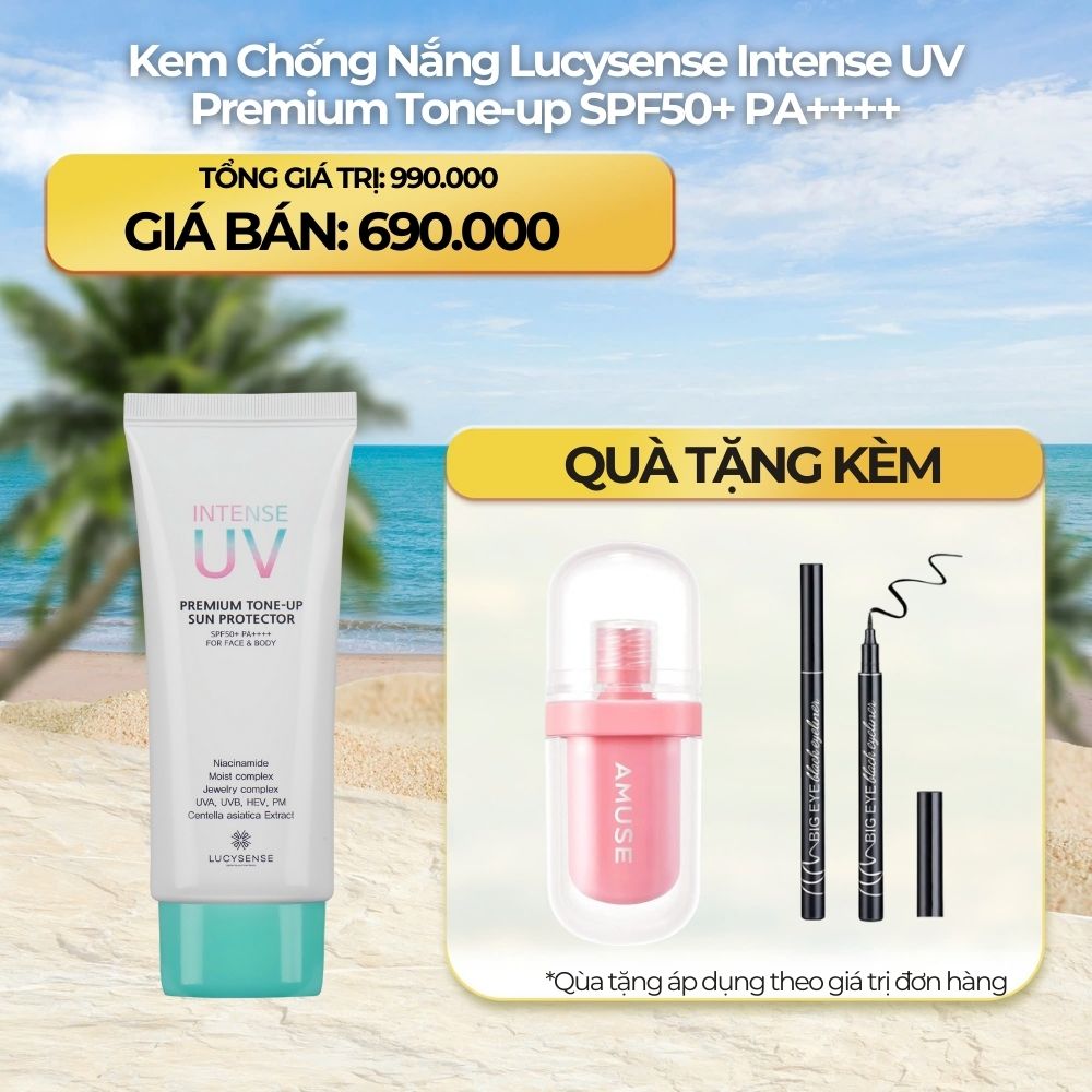 Kem chống nắng Lucysense Premium Tone-up sun protector với chỉ số chống nắng tối cao SPF50+ PA++++ giúp da được bảo vệ dưới tác động của các loại tia gây hại trong môi trường. Ngoài ra, kem chống nắng này còn giúp nâng tone nhẹ nhàng, hỗ trợ đồng đều màu da với công thức chứa dưỡng chất và chiết xuất của các loại đá quý.