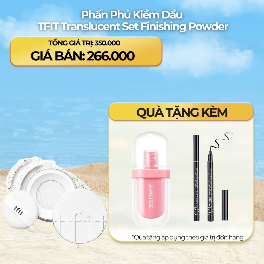 - Phấn phủ không màu phù hợp mọi tông da: TFIT Translucent Set Finishing Powder là phấn phủ dạng bột siêu mịn, trong suốt, giúp cố định lớp nền, kiềm dầu hiệu quả mà không làm thay đổi màu kem nền hay lớp trang điểm.